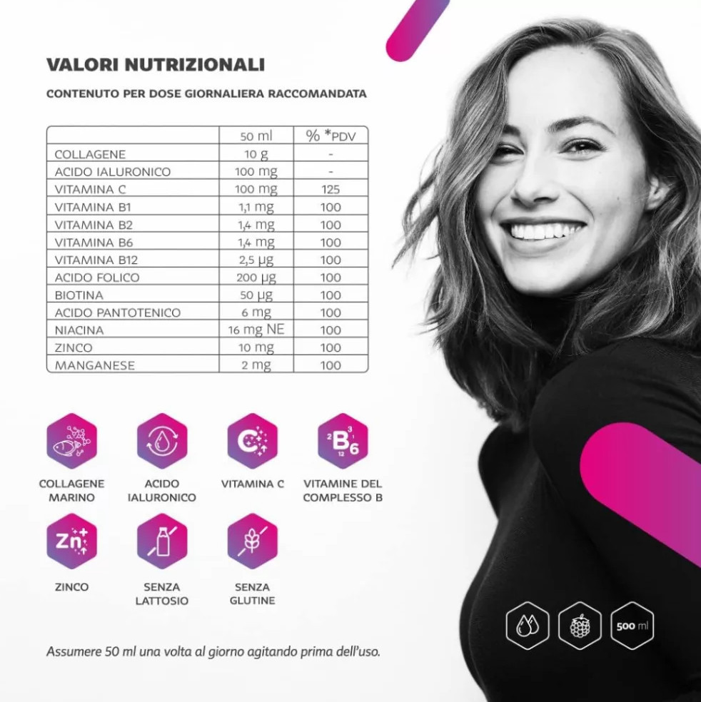 Tisztított víz; hidrolizált tengeri kollagén (halból származó); fruktóz; szacharóz; savanyúságot szabályozó anyag: citromsav; L-aszkorbinsav (C-vitamin); erdei gyümölcs aroma; nátrium-hialuronát; frissességmegőrző: kálium-szorbát; cink-glükonát; mangán-glükonát; színezék: karmin; nikotinamid (niacin); kalcium-D-pantotenát (pantoténsav); pteroilmonoglutaminsav (folsav); piridoxin-hidroklorid (B6-vitamin); tiamin-hidroklorid (B1-vitamin); riboflavin (B2-vitamin); D-biotin; cianokobalamin (B12-vitamin).